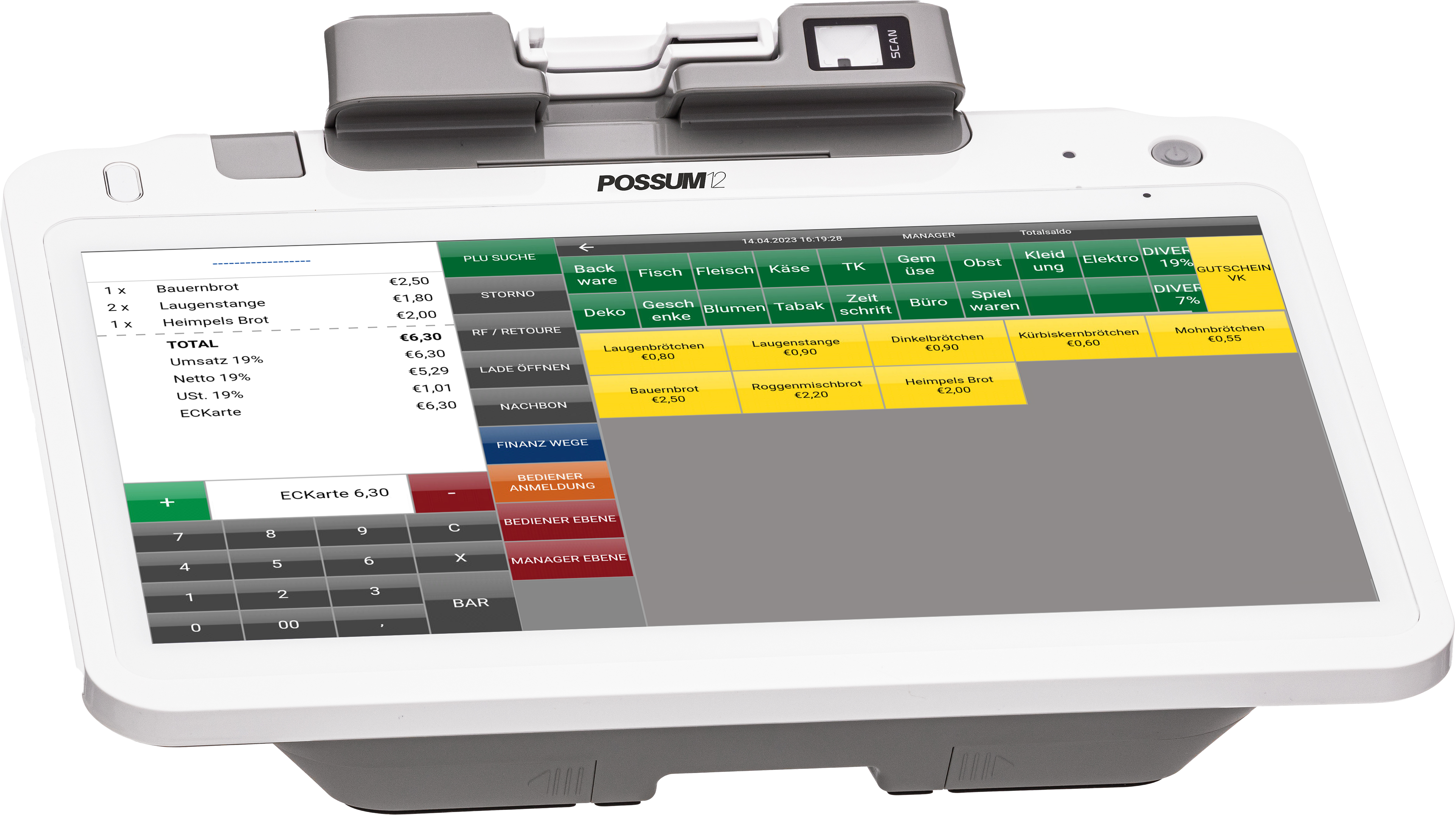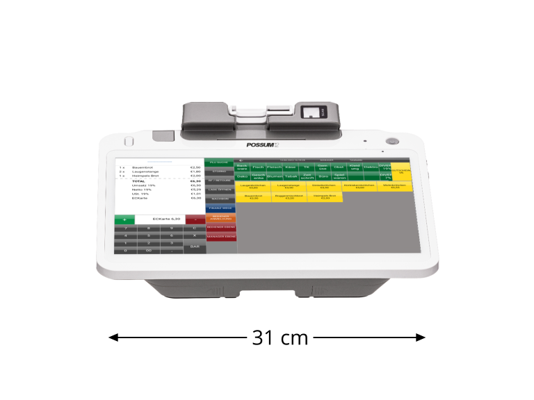 Das POSSUM12 Kassensystem für den Einzelhandel, Gastronomie oder Dienstleister. Durch die Flexibilität der Oberfläche richten wir Ihnen bei der Grundprogrammierung die gewünschten Funktionen ein. So werden Sie im Einzelhandel Rabatt und Nachlasstasten finden während Sie bei der Gastronomiekasse unter anderem die klassiche Tischfunktion sowie die Bewirtungsbelegfunktion finden werden. Das POSSUM16 smartPOS fügt sich in nahezu jeden Betrieb optimal ein. Die vorinstallierte Kassensoftware und die Programmiernug durch uns als Kassenfachdistributor seit über 25 Jahren nimmt Ihnen alle Sorgen ab. Das einzige was Sie noch tun müssen ist die Kasse anzumachen und loszulegen.
